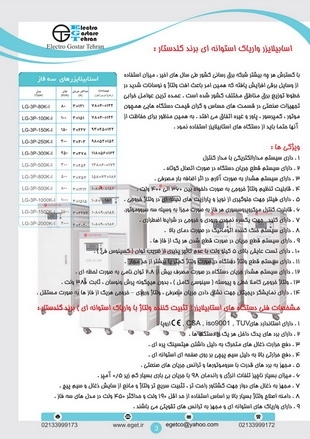 برای اطلاع از مشخصات انواع مدلهای موجود و کاتالوگ این محصول فایل کاتالوگ را از وبسایت ما به آدرس و WWW.EGET.IR دانلود نمایید در صورت خواستن اطلاعات تکمیلی و مشخصات فنی محصولات استابلایزر های تک فاز و یا استابلایزر های سه فاز با ما با شماره های 33999172 یا 33999173 تماس بگیرید و یا جهت ارسال پیش فاکتور یا لیست قیمت ها مارک ها و مدل های محصولات استابلایزر درخواست خود را به شماره فکس 33999173 ارسال فرمایید.
