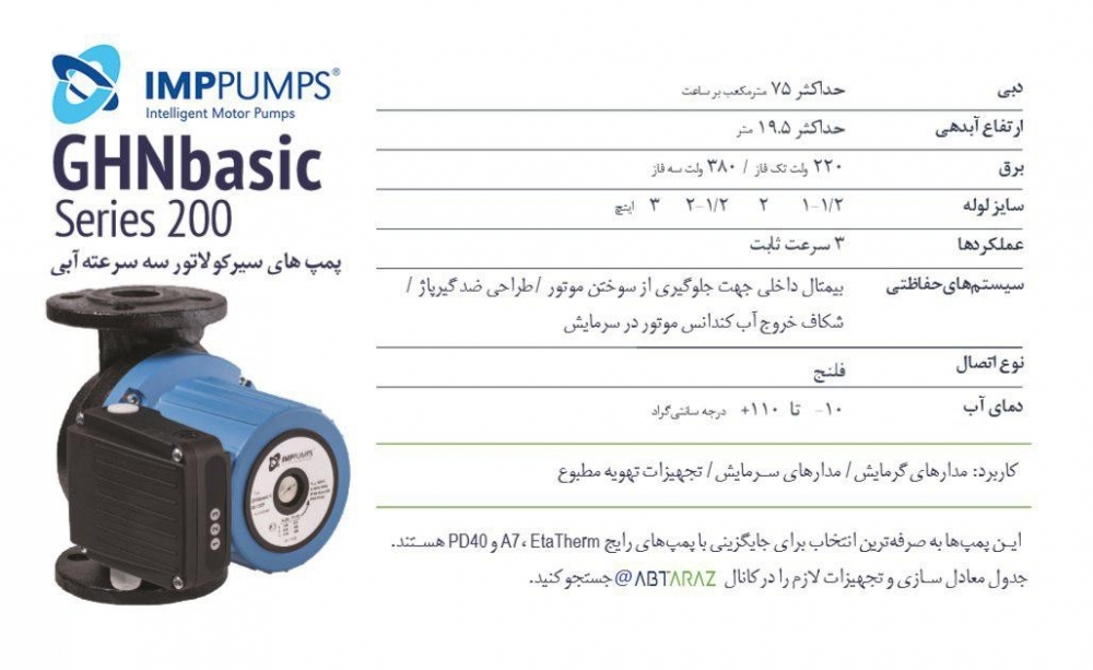 کاربرد: مدارهای گرمایش /مدارهای سرمایش / تجهیزات تهویه مطبوع این پمپ به صرفه ترین انتخاب برای جایگزینی با پمپ های رایج ETA TERM- A7 - PD 40 هستند . جدول معادل سازی و تجهیزات لازم را در کانال ABTARAZ جستجو کنید . T.me/abtaraz :لینک کانال تلگرام