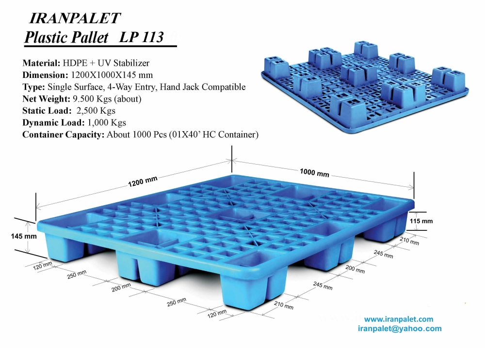 تولید شده از مواد درجه یک HDPE تحمل بار درحرکت 600 کیلو تحمل بار در حالت سکون 2000 کیلو قابلیت حمل با لیفتراک و جک پالت سبک و قابل جابجایی راحت با وزن 9.5 کیلو گرم و با قابلیت در هم فرو رفته و گرفتن جای کمتر در هنگامی که استفاده نمی شوند . اطلاعات بیشتر www.iranpalet.com 09127233491