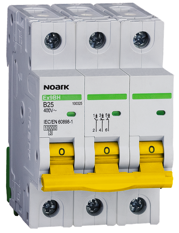 کلید مینیاتوری AC تیپ Ex9BS,Ex9BN,Ex9BH کاربرد : مصارف عمومی AC شامل کاربردهای مسکونی و صنعتی مطابق با استانداردهایIEC60898-1 جریان نامی ۱ الی ۶۳ آمپر منحنی قطع B, C, D قدرت قطع اتصال کوتاه ۱۰ کیلو آمپر برای تیپ Ex9BH و ۶ کیلو آمپر برای تیپ Ex9BN و 4/5 کیلو آمپر برای تیپ Ex9BS 1پل، 1پل+نول، 2پل، 3پل، 3پل+نول و 4پل (عرض هر پل 18میلیمتر) دسته رنگی متناسب با جریان کلید برای تیپ Ex9BH رنج وسیعی از تجهیزات جانبی شامل کنتاکت کمکی، خطا، ترکیبی (کمکی +خطا) ، رله شانت تریپ و آندر ولتاژ قابلیت نصب حداکثر 3 واحد کنتاکت کمکی، خطا و یا ترکیبی (کمکی+خطا) و همزمان نصب حداکثر 2 رله تریپ (شانت و آندر) نصب تمامی تجهیزات جانبی از سمت چپ می باشد. قابلیت نصبEx9LE در سمت راست کلید جهت حفاظت از جریان نشتی کلید مینیاتوری DC (با پلاریته) تیپ Ex9BD کاربرد : مصارف عمومی DC شامل اتوماسیون، کنترلی و همچنین کاربردهای خانگی ولتاژ کارکرد (Ve):ی220 ولت DC در هر پل جریان نامی 1 الی 63 آمپر منحنی قطع C, k قدرت قطع اتصال کوتاه 10 کیلو آمپر 1 و 2 پل (عرض هر پل 18میلیمتر) رنج وسیعی از تجهیزات جانبی شامل کنتاکت کمکی، خطا، ترکیبی (کمکی +خطا) و رله شانت تریپ و آندر ولتاژ قابلیت نصب حداکثر 3 واحد کنتاکت کمکی، خطا و یا ترکیبی و همزمان نصب حداکثر 2 رله تریپ (شانت و آندر) نصب تمامی تجهیزات جانبی از سمت چپ می باشد. با لحاظ پلاریته